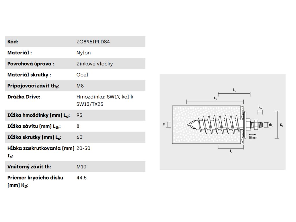 - Patentovaná hmoždinka sa skladá z jednodielnej hmoždinky vrátane predmontovaného tesniaceho krúžku a predmontovaného špeciálneho závitového čapu (M8 alebo M10).