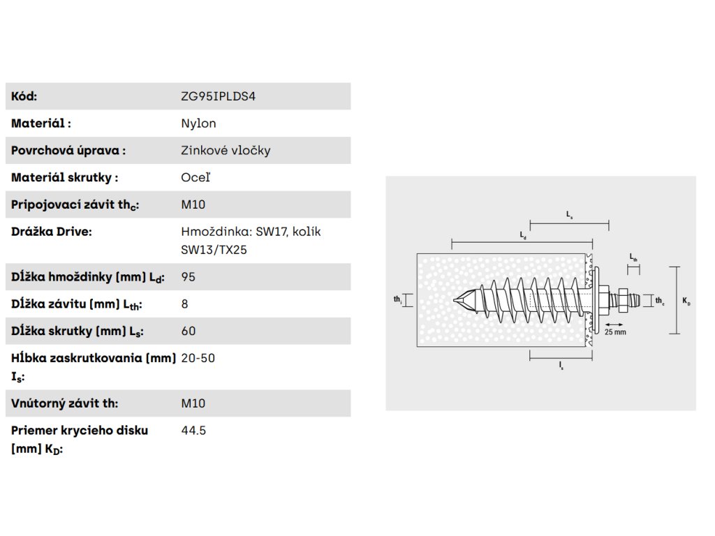 - Nylonová hmoždinka odolná voči starnutiu, poveternostným vplyvom a UV žiareniu odoláva teplotám od -40 do +80 °C.