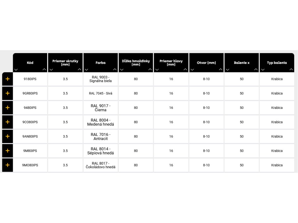 - IPS je k dispozícii v rôznych farbách, aby zodpovedali najbežnejším materiálom. Vzhľadom na dĺžku 80mm je IPS vhodný pre takmer všetky izolované fasády (od 80mm) z polystyrénových dosiek atď.