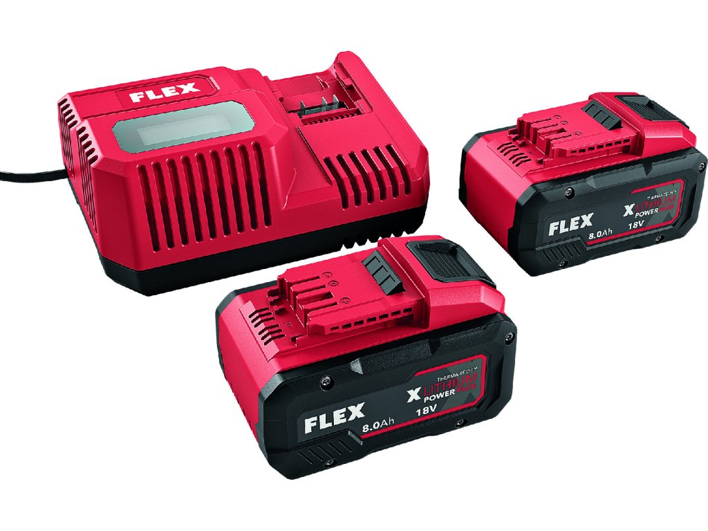 - Získajte všetko potrebné pre profesionálnu prácu s 18 V náradím od FLEX: set obsahuje dva batériové články s vysokou kapacitou 8,0 Ah a rýchlonabíjačku.