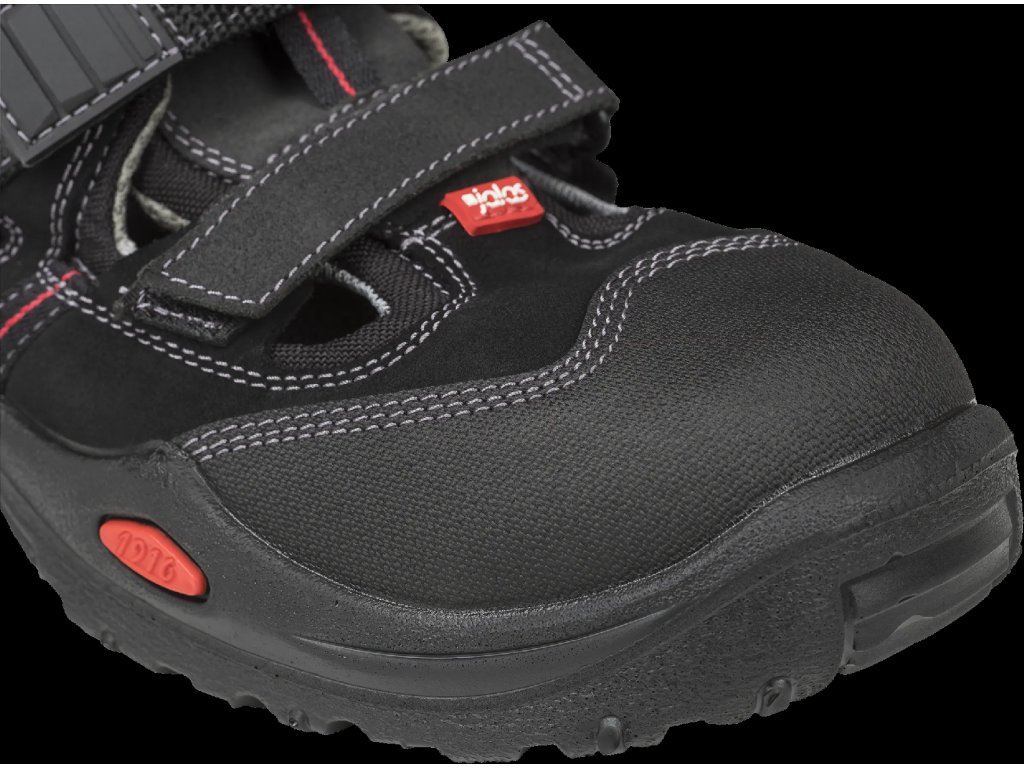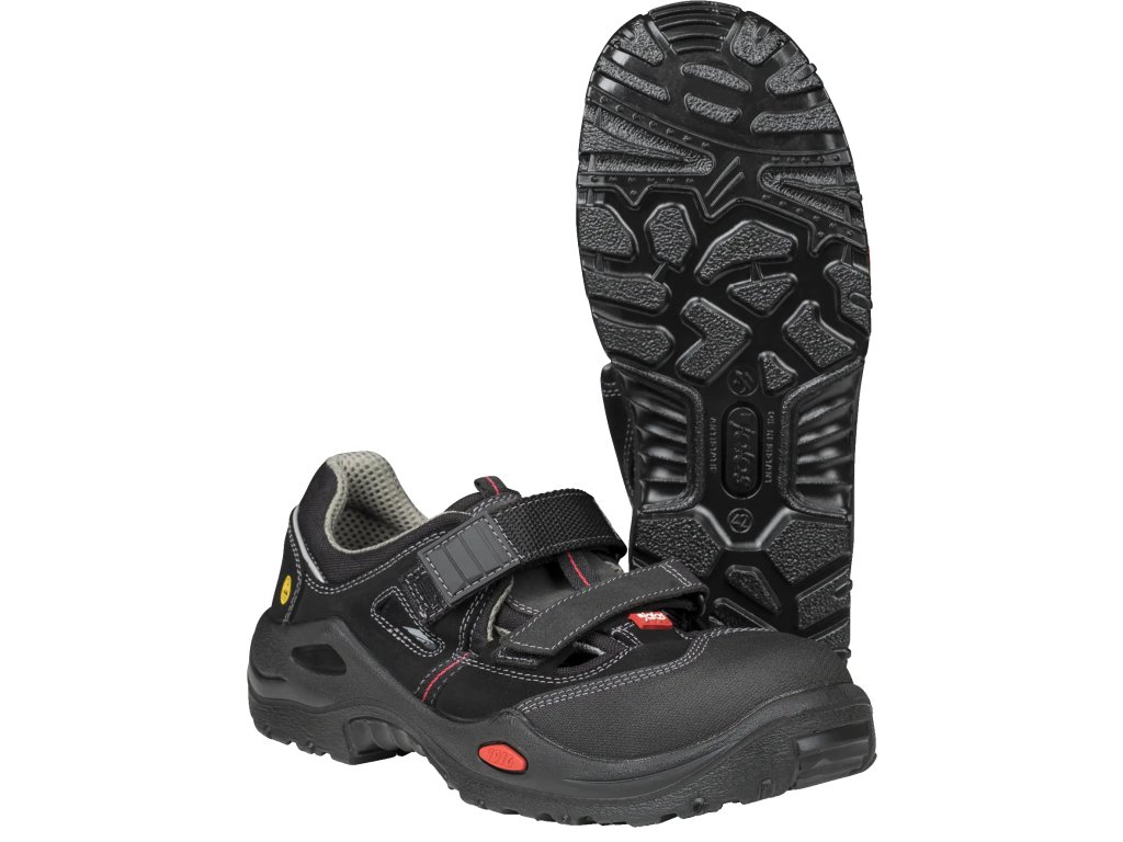 - Zvršok z PU potiahnutej kože a štiepanej kože poskytuje chodidlám stabilitu, oporu a antistatické vlastnosti. Sandále sú vybavené hliníkovou ochrannou špičkou JALAS®, ktorá chráni prsty pred nárazom a tlakom. Textilná planžeta proti prepichnutiu s plazmou ošetrenou zliatinou (PTC) zabezpečuje ochranu pred ostrými predmetmi na podlahe.
