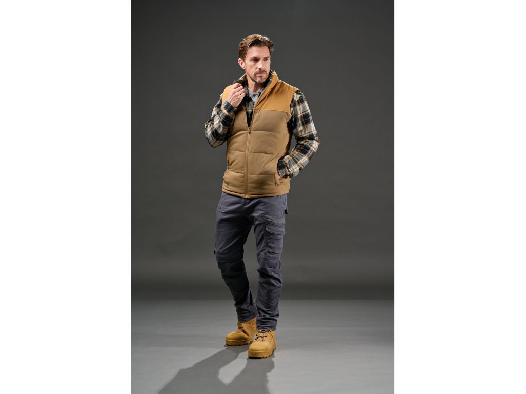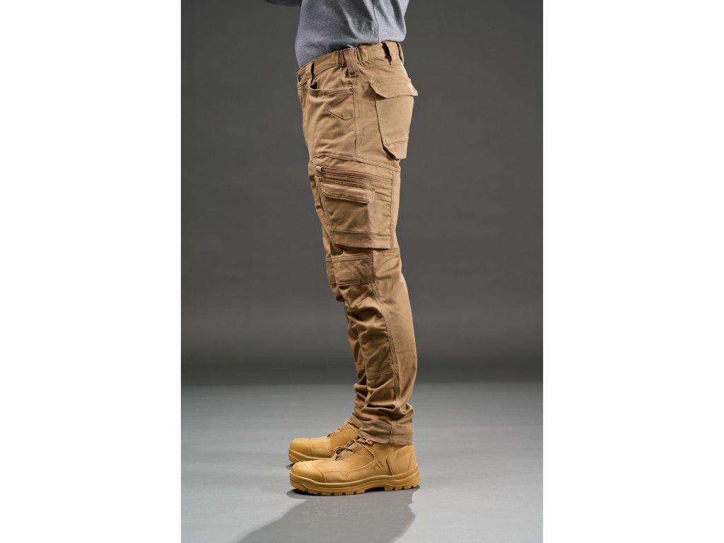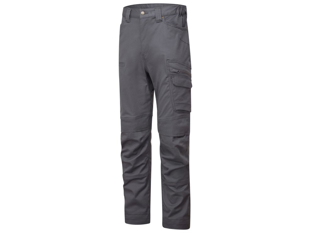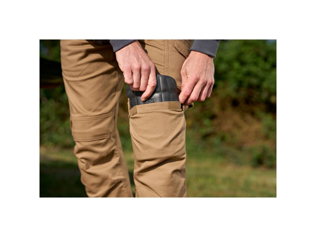 - Ergonomický strih s predohnutými kolenami, vyšším zadným pásom a nastaviteľnou dĺžkou nohavíc zlepšuje pohodlie pri pohybe aj pri fyzickej práci. Nohavice disponujú viacerými praktickými vreckami vrátane stehenných, zadných či vrecka na telefón alebo pracovné nástroje.