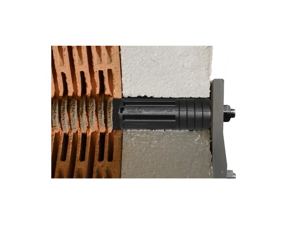 - Takmer žiadny tepelný most vďaka robustnému sklenému vláknu vystuženému nylonovému telu. Vnútorný závit s hĺbkou 80 mm umožňuje dokonalé tepelné oddelenie a veľkú hĺbku zasunutia závitového kolíka.