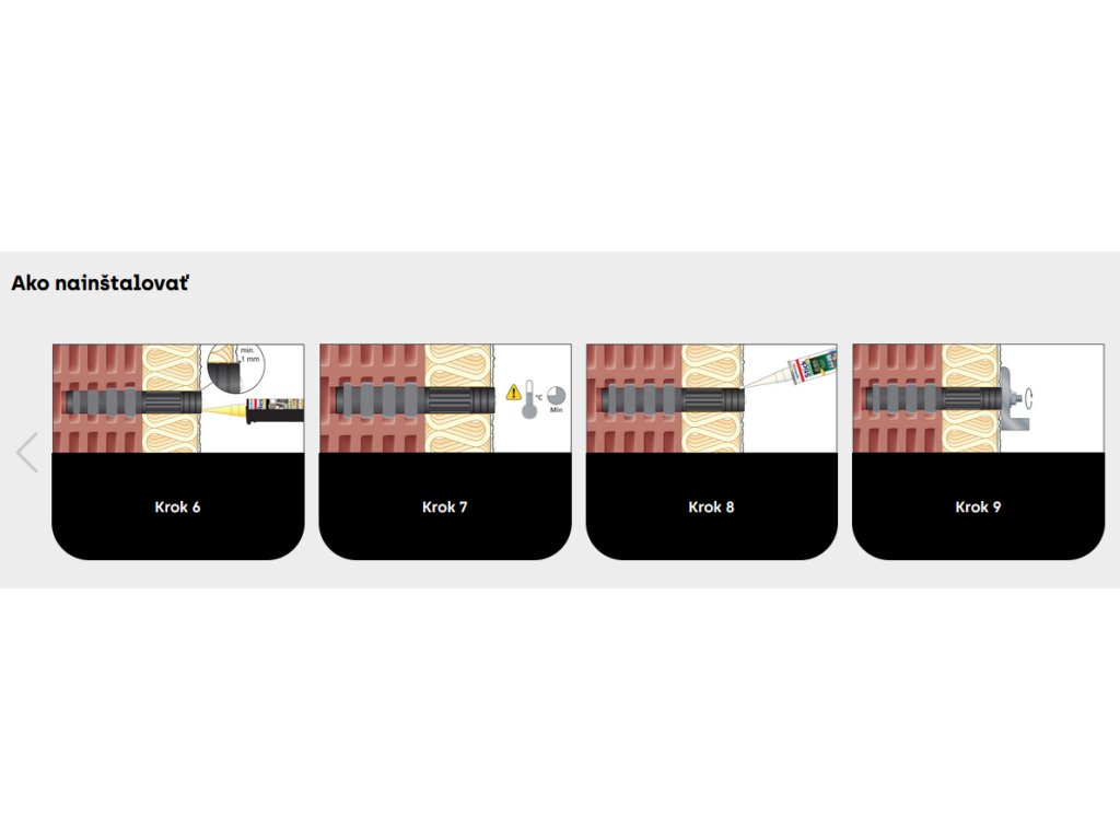 - Ide o vysoko odolný systém na pripevnenie, markíz, francúzskych balkónov, zábradlí, satelitných antén atď. cez izoláciu.